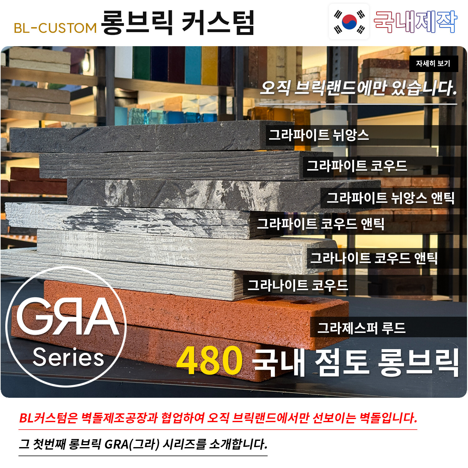 국내에서 선보이는 롱브릭 중 롱브릭으로 일반적인 국내 점토롱브릭이 350~400사이즈라고 할때 480사이즈 길이를 지니고 있습니다.